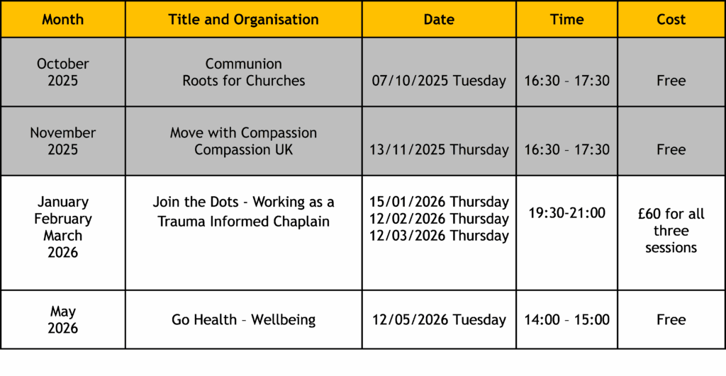 The next webinars in our programme form a three-part series running from January to March 2026, facilitated by Join the Dots ‘Becoming a Trauma Informed Chaplain’. Booking links and more information in the next section.